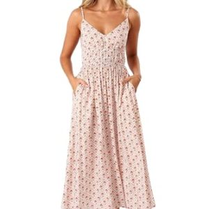 - Front and back V-necks, spaghetti straps, waist seam, ruffle detail along surplus neck/bodice, ruffle cold shoulder, and ruffle cascade along midi/maxi length high-low skirt.