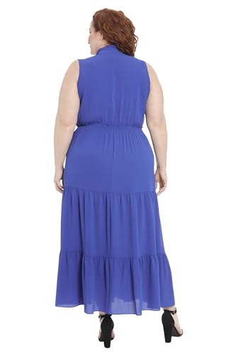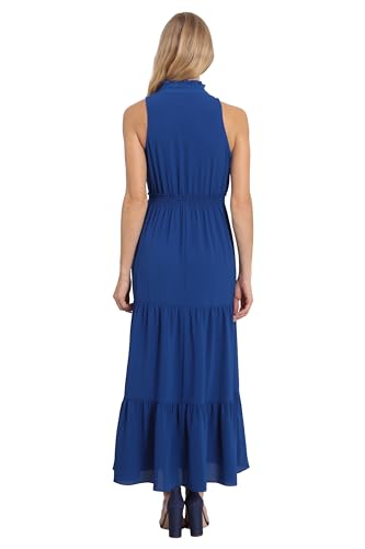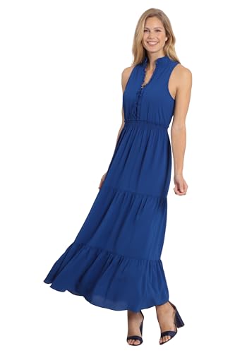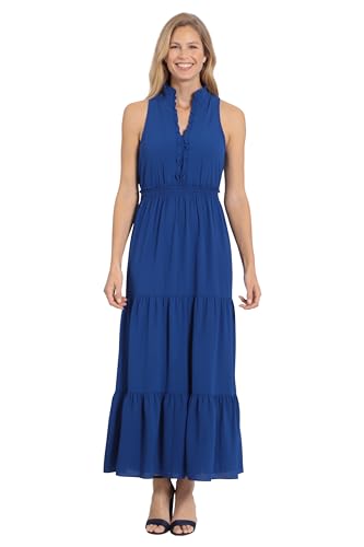 - Stand collar mock neck with notch v-neck opening and ruffle detail, sleeveless, ruffle details also at center front bust and at top of smocked waistband, and a tiered maxi length skirt.