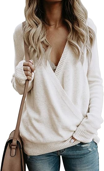 Womens Deep V-Neck Wrap Sweaters Long Sleeve Front Cross Loose Knitted Pullover Jumper Fall Winter Tops