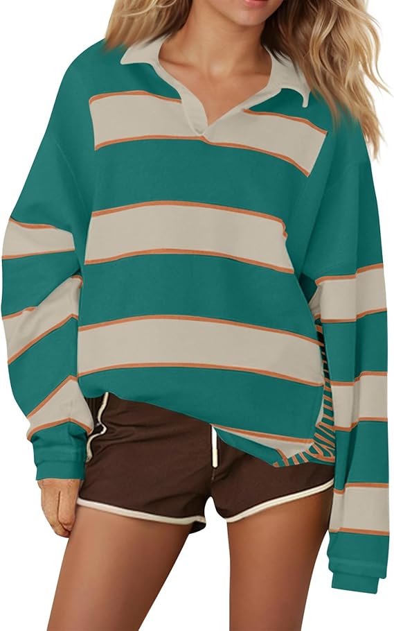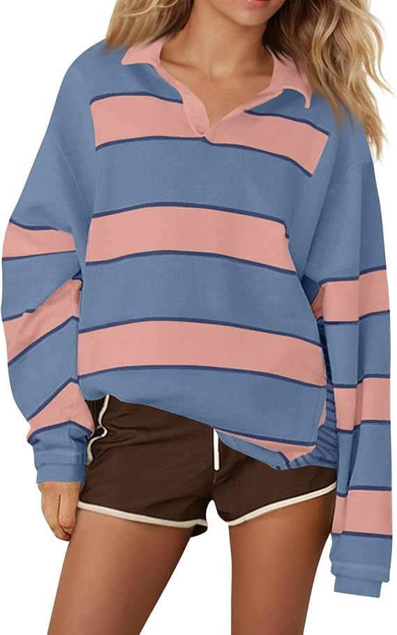 Oversized Striped V Neck Sweatshirt Women Cute Hoodies Tunic Pullover Sweatshirts Long Sleeve Sweat Shirts