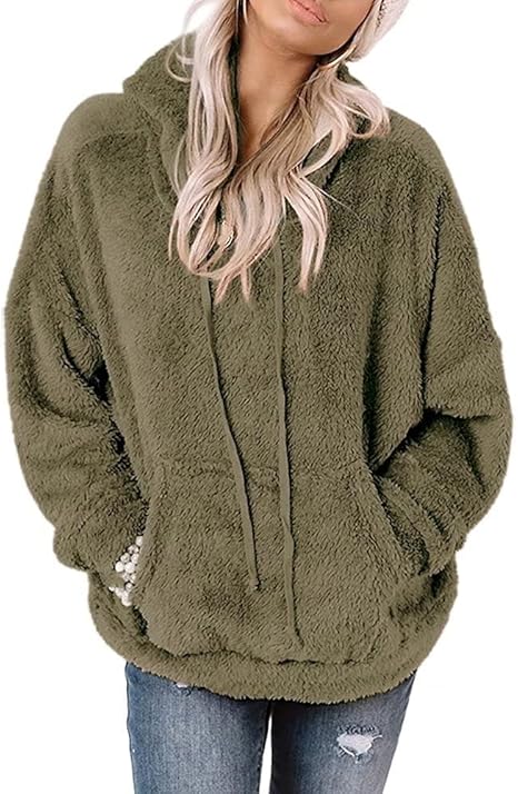 Women's Long Sleeve Sherpa Pullover Fuzzy Fleece Sweatshirt Casual Loose Fuzzy Hoodies with Pockets
